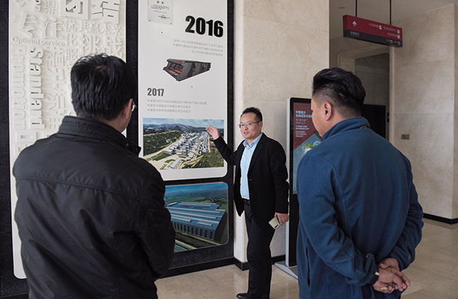 考察團(tuán)先來(lái)到中譽(yù)鼎力智能裝備有限公司新廠區(qū),先后了解了中譽(yù)鼎力企業(yè)發(fā)展歷程、五位一體循環(huán)建材產(chǎn)業(yè)園項(xiàng)目、智能化一體生產(chǎn)車間和智能礦山管理系統(tǒng)。